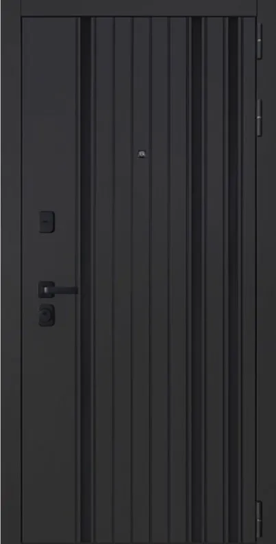 Порошковое покрытие "муар черный". Панель МДФ 10 мм (цвет "черная шагрень"). Объемная фрезеровка. Вертикальные вставки из пластика 3 шт (цвет "черный"). Наличник МДФ 80 мм.